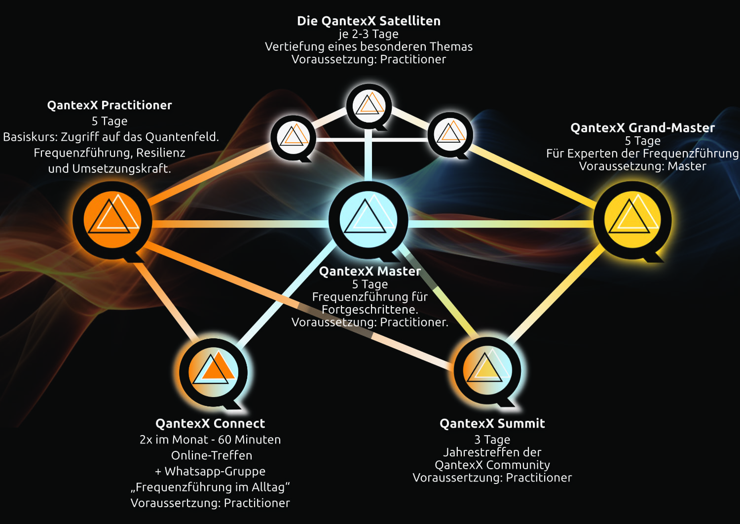 Die QantexX Ausbildung bietet Dir sowohl die Fähigkeiten und Techniken, Dein Leben zu meistern, als auch in Deinem beruflichen Wirken überragende Führungs- und Umsetzungskraft zu entwickeln. Für die, die sich nach dem Practitioner und dem Master in Abstimmung mit uns entscheiden, QantexX Trainer zu werden, wird sie sogar zur Berufsausbildung.